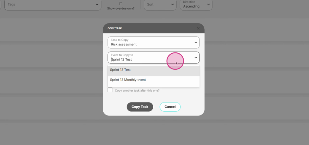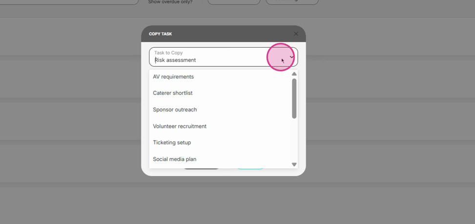 Decide if you want to copy it to the same event or a different one. For this example, we're not copying the assigned team member or the reminder.