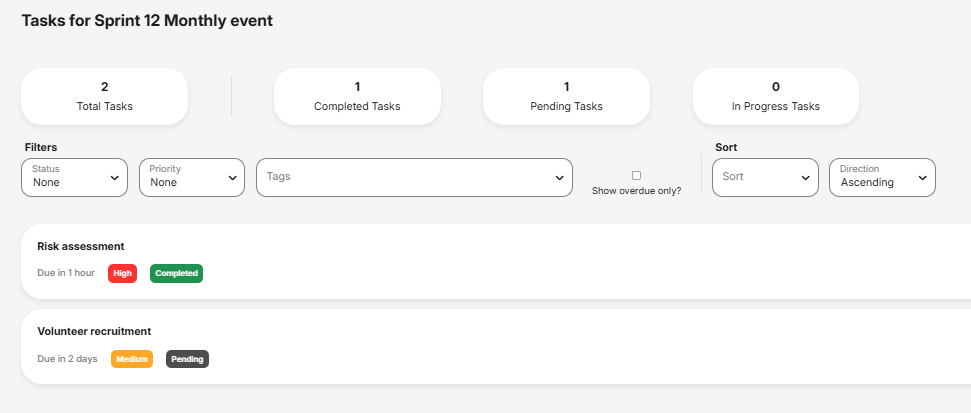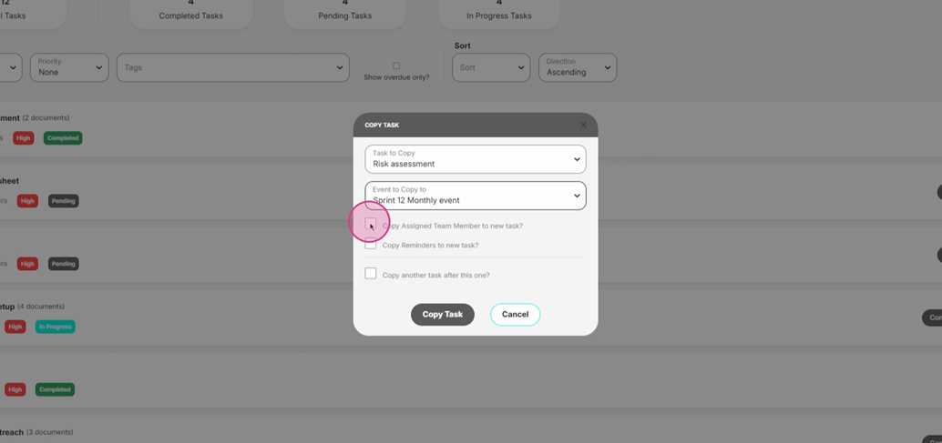 You can now assign the task to a different team member. Consider changing the task status to Pending and then update the task. The new event with the copied tasks will open. The tasks are now available in the new event.
