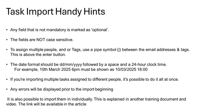 To learn how to download and what the fields require, click > How to download the Import template for Tasks & Task Related Run Sheet Items